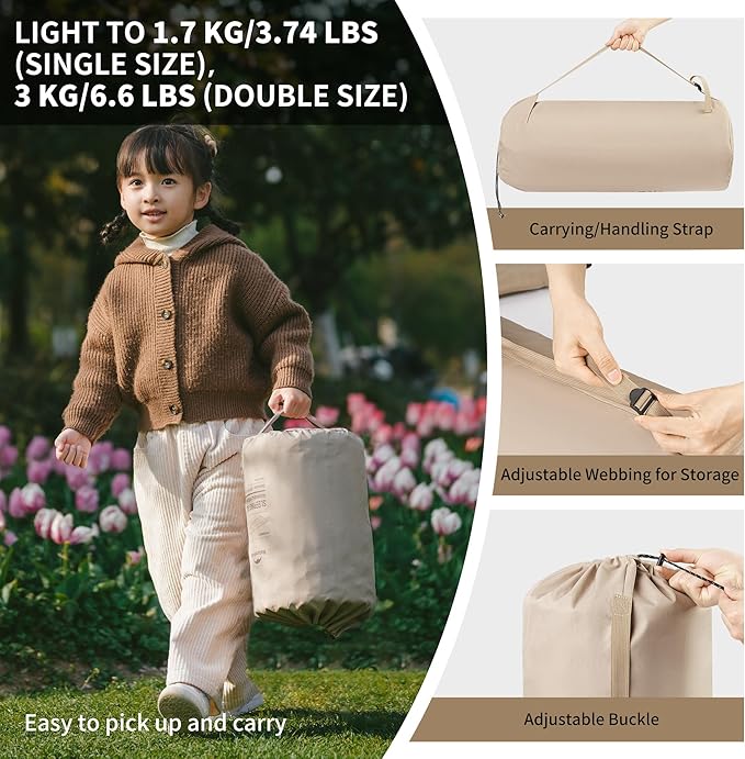 - WIDE RANGE OF USAGE SCENARIOS: There are two styles of sleeping mats to choose from. Single model: 200*76cm/ 78.7*30’’, double model: 200*132cm/ 78.7*52’’. You can fold the air mattress after pumping and then roll it up, tie it with a strap and then put it into the storage carry bag. The carry bag can be carried or carried on your back, convenient for you to go to the following scenarios: camping / outdoor / home / travel / car
