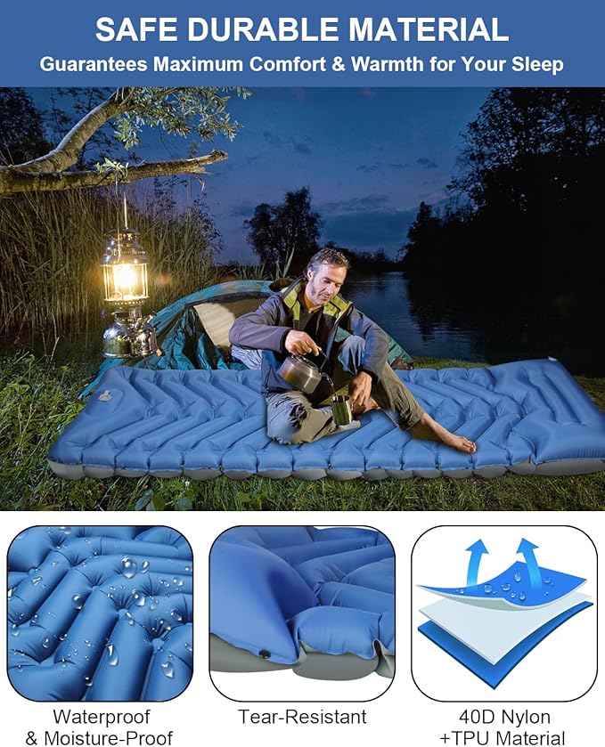 - 40D Nylon & Waterproof TPU Sealing Coating: The outer layer of the camping sleeping mat is made of outdoor-grade 40D nylon, so it won't leak or tear, even when used in harsh outdoor environments. The inside of the camping mats for sleeping is made of multi-layer TPU waterproof coating, which is soft and waterproof, and can be easily wiped off with a towel even if the camp pads gets wet.