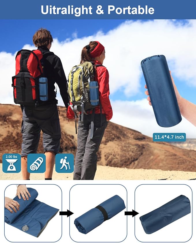 - Compact & Portable: The sleeping pad for camping is only the size of a water bottle when folded, measuring only 11.4 “x4.7” and weighing 2 lbs. The one-piece pillow design also eliminates the hassle of carrying extra pillows, it can easily fit into your backpack and won't add any burden to your trip, perfect for hiking, backpacking, mountaineering and trekking.
