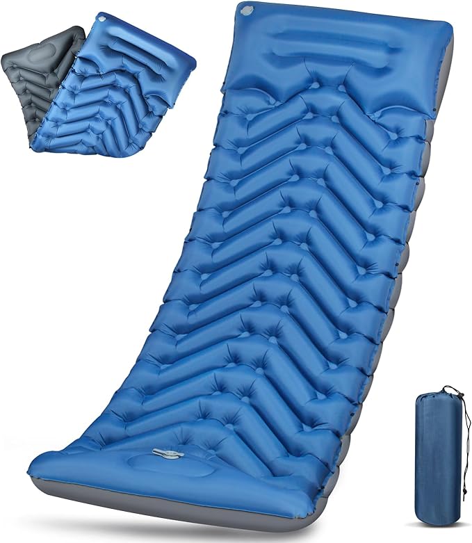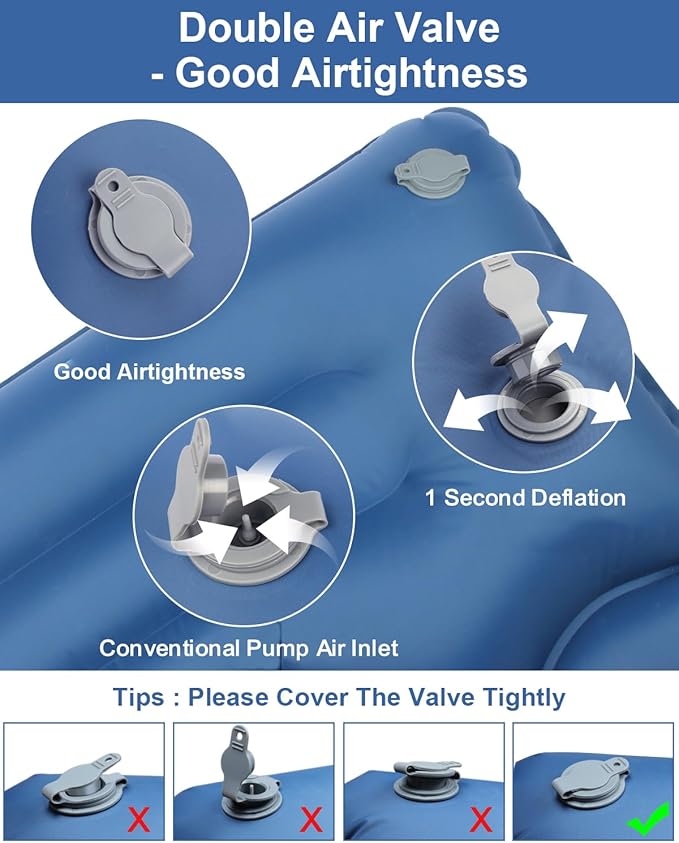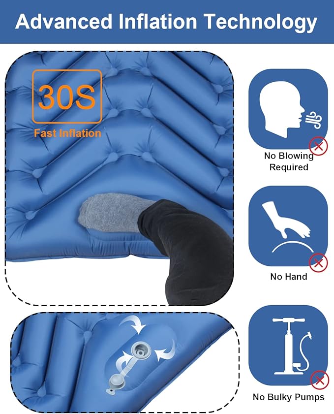 - Built-in Pump & Non-Leakage Membrane Bleeder Valve: The inflatable sleeping pad comes with an innovative built-in foot pump that allows you to fully inflate the sleep pad in 30-60 seconds by simply stepping on the sleeping mat (deflation takes only 1 second), eliminating the need to carry a bulky pump. The upgraded leak-free membrane deflation valve and heat-sealed seams around the edges of the camping pad improve overall airtightness, so you never have to worry about sneaky air leaks while using the camping pads for sleeping!