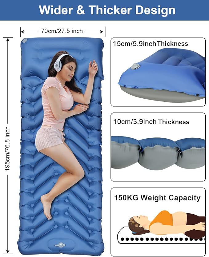 - Still Worried About Not Sleeping Well?: The maximum size of the sleeping pad is 78*27.5 inches when full of air, and the thickness can be up to 3.9 inches (the thickness of the pillow is even up to 5.9 inches). The extra wide size and extra thick thickness provide you with enough contact area and strong support when camping, away from uneven ground and hard rocks, making you as comfortable as in bed.