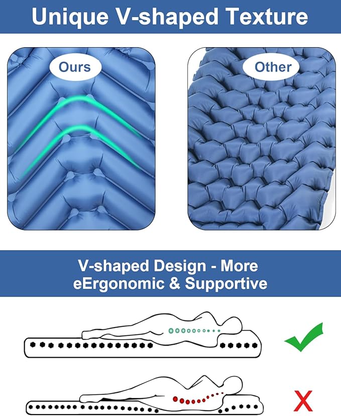 - One-Piece Pillow & V-Shaped Airbag: The ergonomically integrated design of the camping sleeping pad comes with a one-piece pillow that fits the curves of your head and neck to relieve neck pressure. Because the V-Shaped airbag has an undulating up and down slope and an inclined direction pattern, it maintains air circulation in the back, allowing the pressure on the back to be released in all directions, ensuring that you sleep comfortably throughout the night!