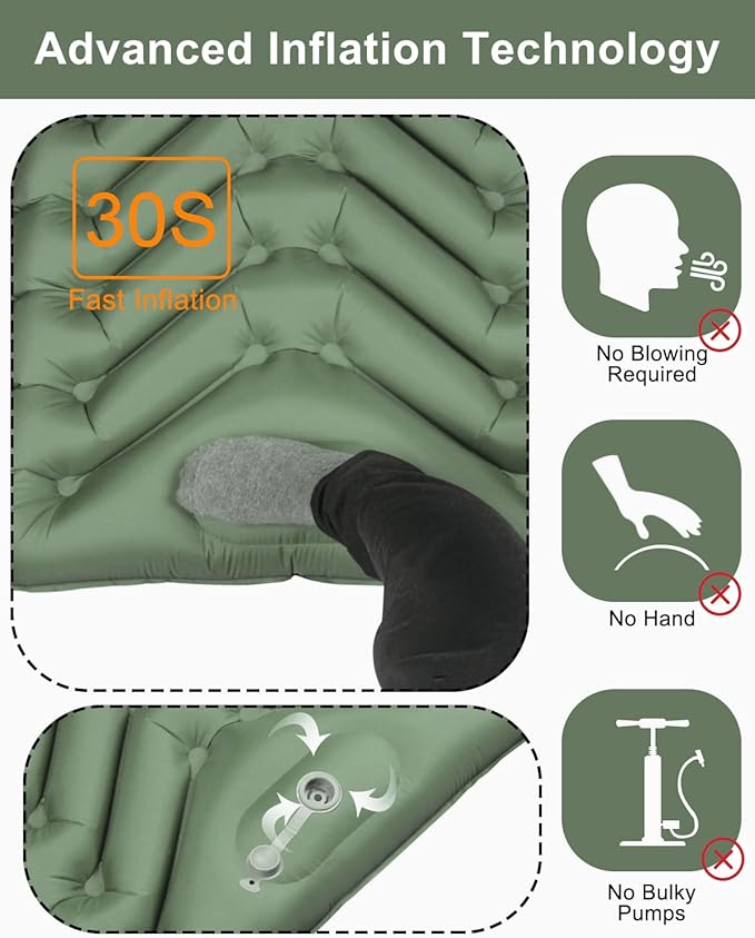- Built-in Pump & Non-Leakage Membrane Bleeder Valve: The inflatable sleeping pad comes with an innovative built-in foot pump that allows you to fully inflate the sleep pad in 30-60 seconds by simply stepping on the sleeping mat (deflation takes only 1 second), eliminating the need to carry a bulky pump. The upgraded leak-free membrane deflation valve and heat-sealed seams around the edges of the camping pad improve overall airtightness, so you never have to worry about sneaky air leaks while using the camping pads for sleeping!