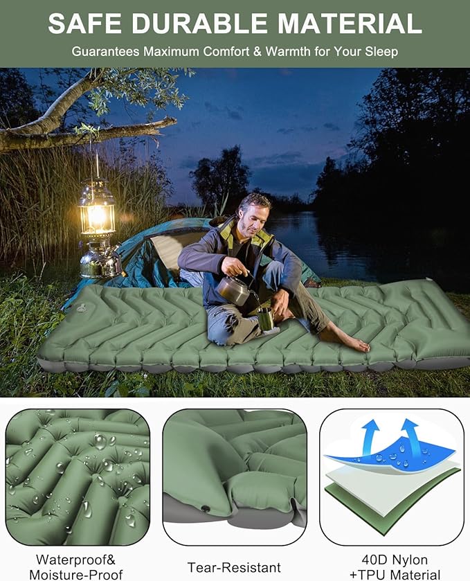 - 40D Nylon & Waterproof TPU Sealing Coating: The outer layer of the camping sleeping mat is made of outdoor-grade 40D nylon, so it won't leak or tear, even when used in harsh outdoor environments. The inside of the camping mats for sleeping is made of multi-layer TPU waterproof coating, which is soft and waterproof, and can be easily wiped off with a towel even if the camp pads gets wet.