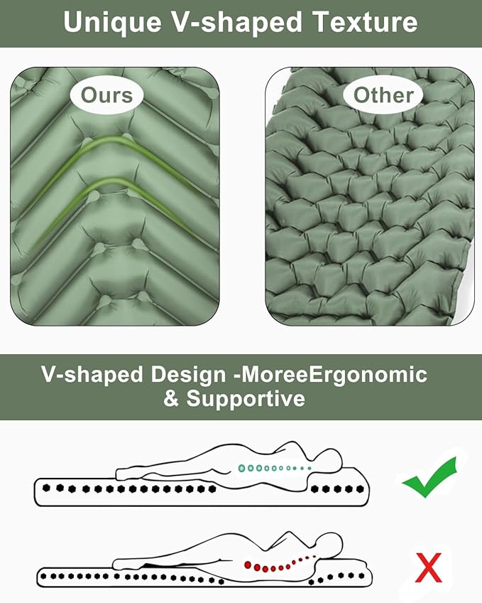 - One-Piece Pillow & V-Shaped Airbag: The ergonomically integrated design of the camping sleeping pad comes with a one-piece pillow that fits the curves of your head and neck to relieve neck pressure. Because the V-Shaped airbag has an undulating up and down slope and an inclined direction pattern, it maintains air circulation in the back, allowing the pressure on the back to be released in all directions, ensuring that you sleep comfortably throughout the night!