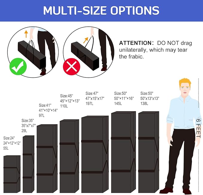 - LARGE CAPACITY: INFANZIA large-capacity duffle bag is one of the essential items for your travel. It can be used to store tents, clothing, sports equipment or foldable strollers. INFANZIA travel bags are available in 50*13*13Inch/127*33*33 CM size to meet your travel needs