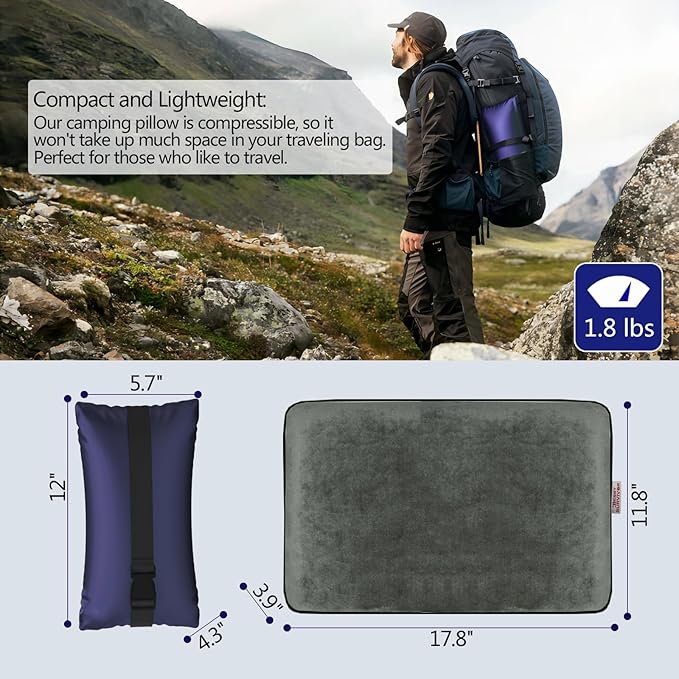 - ✅【Compact and Lightweight】Weighing only 1.8 lb and packing down to 5.7 x 4.3 x 12 inches, this small camping pillow is easy to carry and store, making it perfect for outdoor camping, hiking, and backpacking. camping accessories for tent campers.