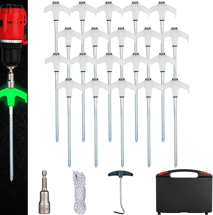 20PCS Camping Tent Stakes Heavy Duty,8 Inch Screw in Tent Stakes Heavy Duty,Nightglow Metal Tent Stakes,with Hex Head Driver,Nail Lifter,Ropes,White