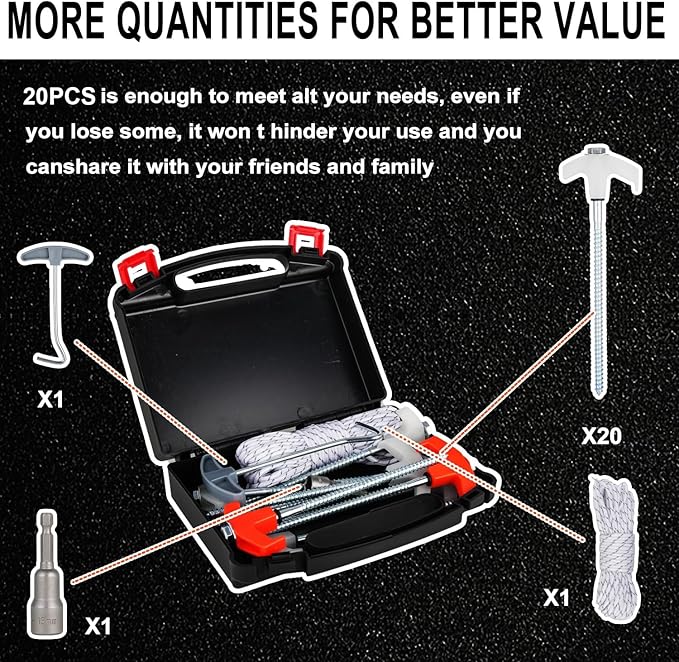 - ACCESSORIES: easy to store and sturdy carrying case, 13mm hex bit, 50FT tent rope.