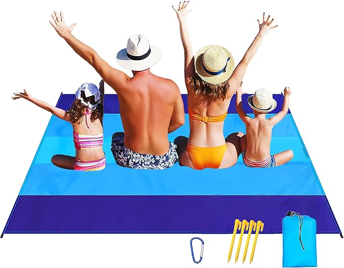 Beach Blanket Sandproof Extra Large Beach Mat Adults Waterproof Quick Drying,Big & Compact Sand Free Mat,Lightweight & Durable with 4 Stakes for Travel Camping Hiking Picnic (Bule-Mixed)