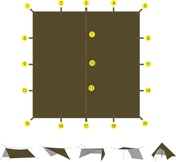 - Bushcraft Tarp has superior puncture resistance and industry-leading 15,000mm waterproof PU coating and . 70D Ripstop Nylon With a total of 19 reinforced webbing loops,you’ve got all angles covered, you can even use the top center loop to make a teepee, attach the side loops to a tree, fence, or peg into the ground and go directly over the top of your tent… you don't even need trees!