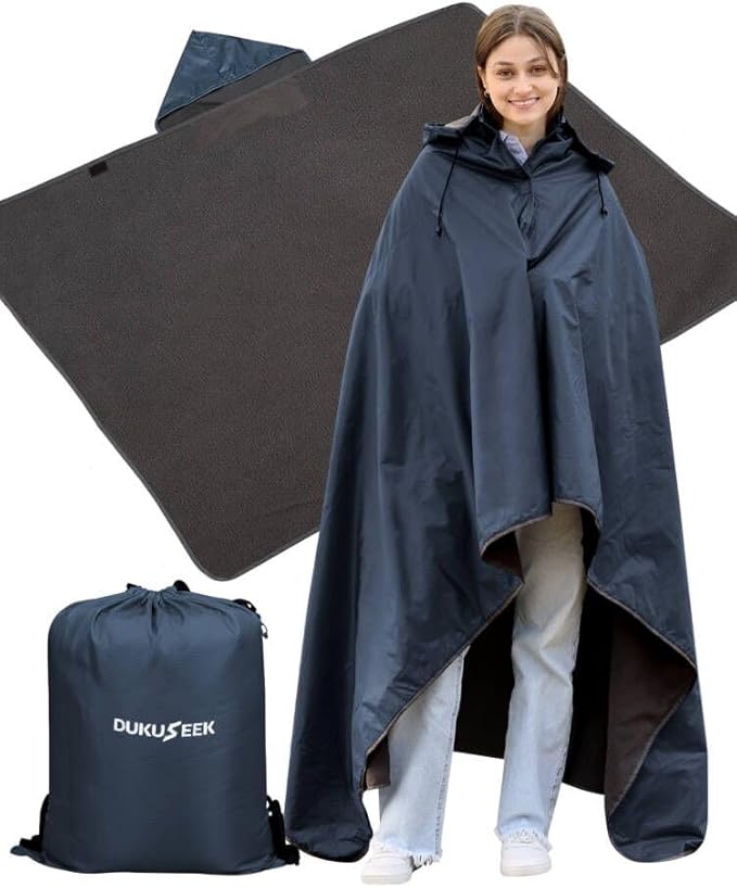 - ✅ MULTIFUNCTIONAL BLANKET - DUKUSEEK waterproof outdoor blanket features a wearable, detachable hood, allowing it to function as a poncho for warmth or as a picnic blanket when the hood is folded. The cloak design frees your hands. Made of durable, pet-friendly nylon that prevents hair buildup. It also serves as an excellent emergency blanket for your car.