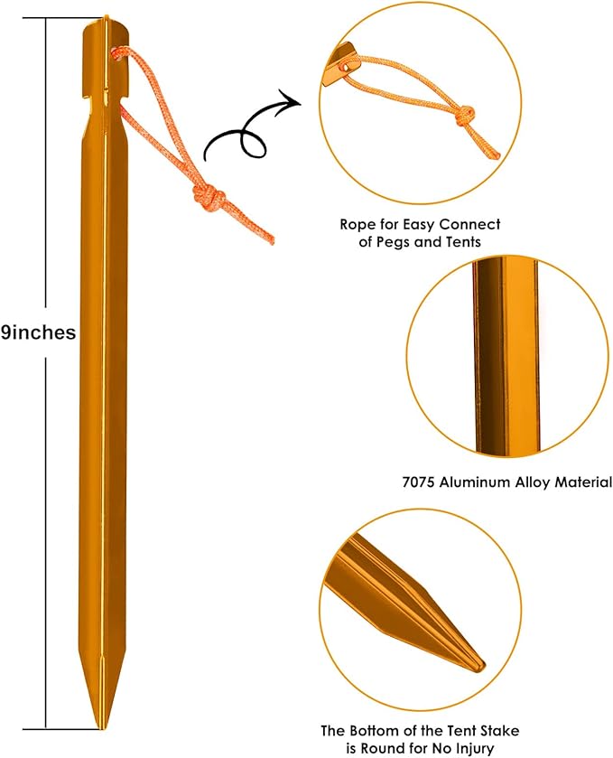 - 4. [ No ACCIDENTAL INJURY ] The bottom of the ground nail is round rather than sharp, and the aluminum tent stakes has a comfortable grip, which can effectively avoid accidental injury.