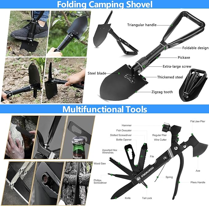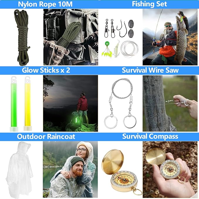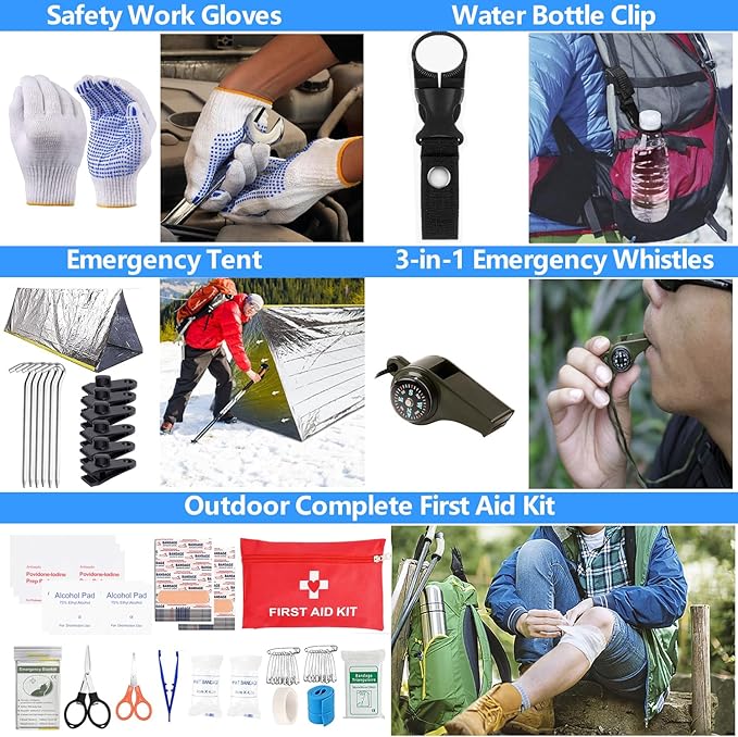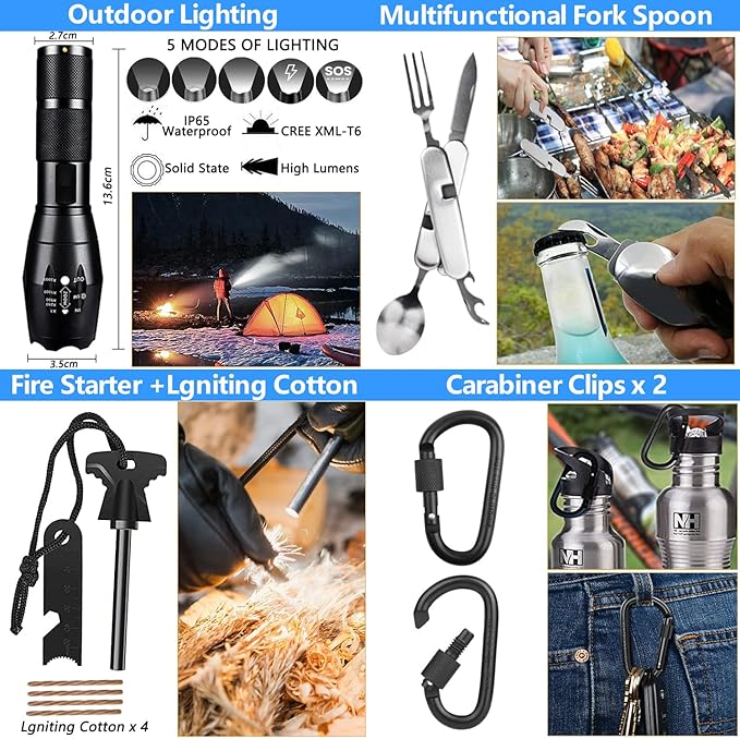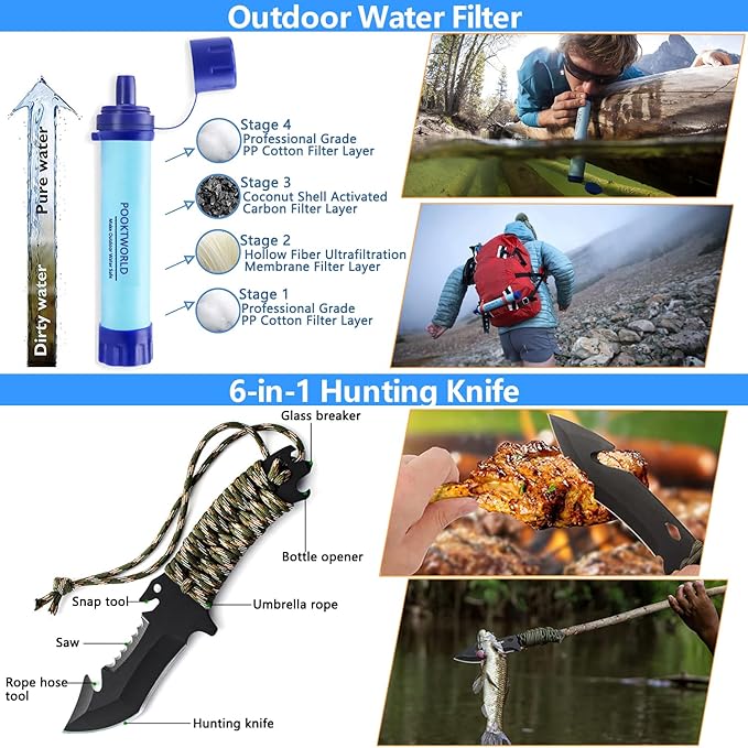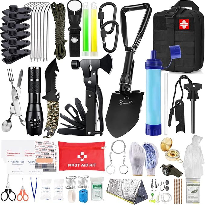 - Must-Have Survival Gear and Equipment: Professional Survival kit includes:1.16-in-1 Multi-Tool; 2.Water filters; 3.5-in-1 folding shovel; 4.Survival hunting knife(blade length:8.5cm); 5.Tent; 6.Carabiner; 7.Rescue blankets; 8.Raincoat; 9.Survival Whistle; 10.Wire saw; 11.First aid kit; etc.Survival kits contain everything you need in emergency situations such as natural disasters or wilderness adventures.