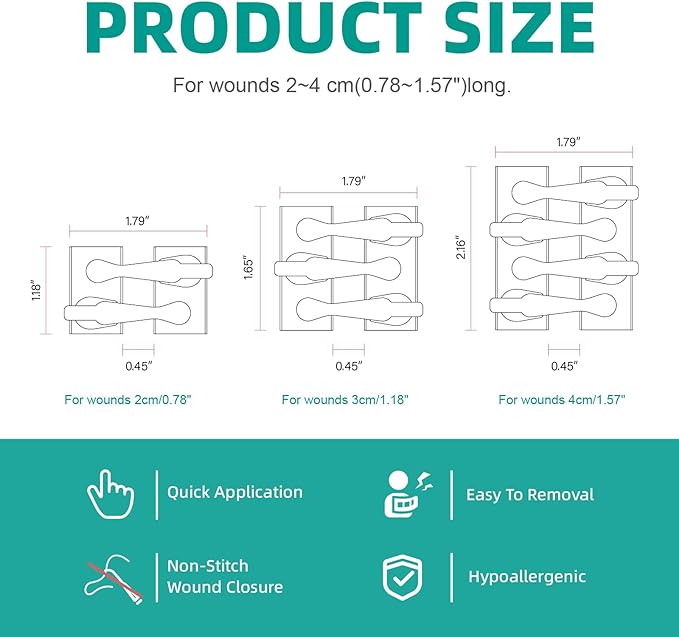 - APPLICABLE SIZES: 2 Strips - For wounds 2cm/0.78", 3 Strips - For wounds 3cm/1.18", 4 Strips - For wounds 4cm/1.57". After using the wound closure strips, apply this dressing to protect the wound. It is recommended to close the wound urgently after injury or to reduce wound tension after surgery to reduce scar formation. USE AFTER SURGERY MUST FOLLOW THE DOCTOR'S ADVICE.