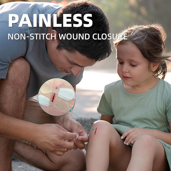 - WOUND CLOSURE STRIPS: It is a non-invasive, painless, alternative to stitches. The laceration closure kit is more convenient than traditional stitches. The device can reduce tension, reduce hyperplasia and beautify wounds, and is ideal for sensitive skin and kids, ensuring a safer and faster recovery.