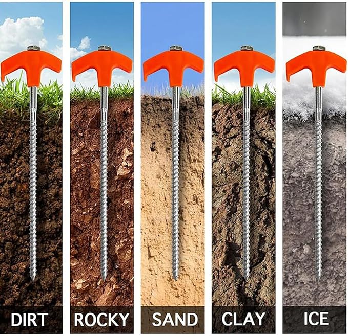 - 【8 Inch Screw in Tent Stakes】Low carbon steel material, Galvanized, High strength, Durable and resistant to rusting! These tent stakes feature a screw-in design for easy and quick installation into the ground. Whether it's grass, hard dirt, gravel, or anything in between, it will hold securely.