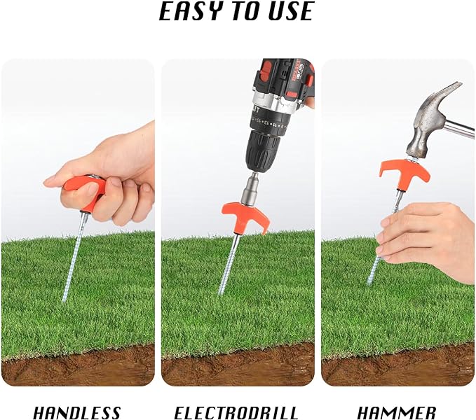 - 【Screw in Tent Stakes Heavy Duty】Our 8" Tent Stakes Setup faster so you can sit back with a beer while watching other campers struggle. With the help of a cordless drill or impact driver, these easy-to-use stakes will have your tents, canopy, gazebo, awning, guy lines or tarps secured to the ground in seconds.