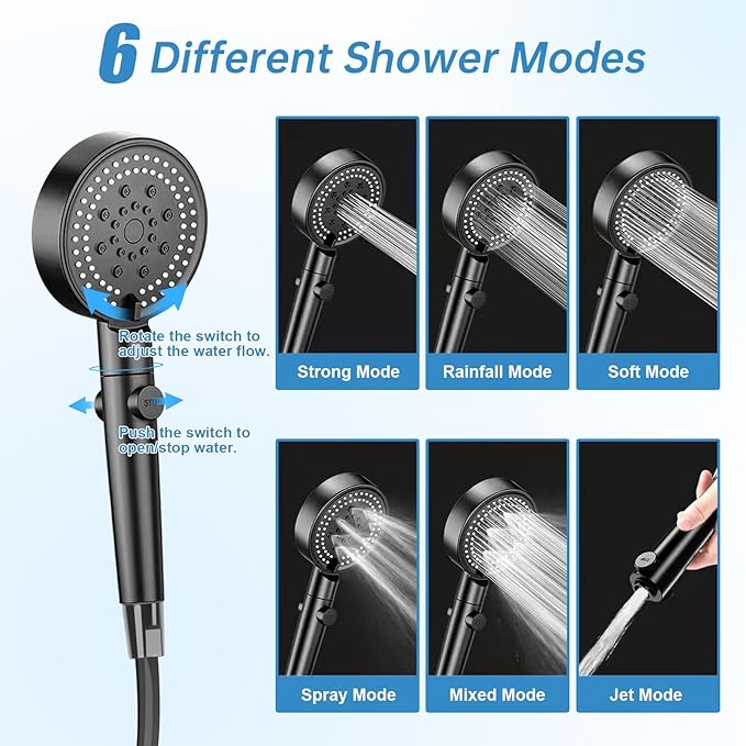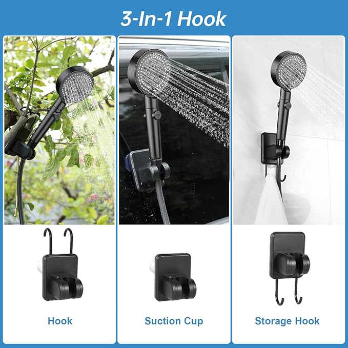 - 𝟲 𝗦𝗵𝗼𝘄𝗲𝗿 𝗠𝗼𝗱𝗲𝘀 𝘄𝗶𝘁𝗵 𝟯-𝗜𝗻-𝟭 𝗛𝗼𝗼𝗸 - 5 different gears can be chosen to use, and there is a spray mode for easy cleaning(detach the head for use) car, floor, toilet, etc. The 3-in-1 hooks with suction cups for you to use anywhere indoors and outdoors.