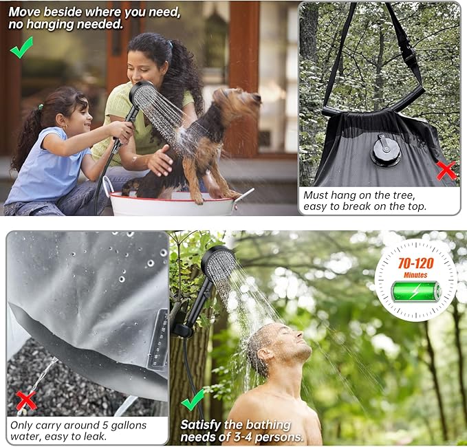 - 𝗠𝗲𝗲𝘁𝘀 𝗢𝘃𝗲𝗿 𝟯 𝗣𝗲𝗿𝘀𝗼𝗻 𝗦𝗵𝗼𝘄𝗲𝗿𝗶𝗻𝗴 - This portable shower has built-in 6000mAh lithium battery, which provides up to 120 minutes of battery life for showing. Satisfying about 3-4 person showering under fully charged. You can charge it through your phone charger, laptop's USB output or car's USB output.