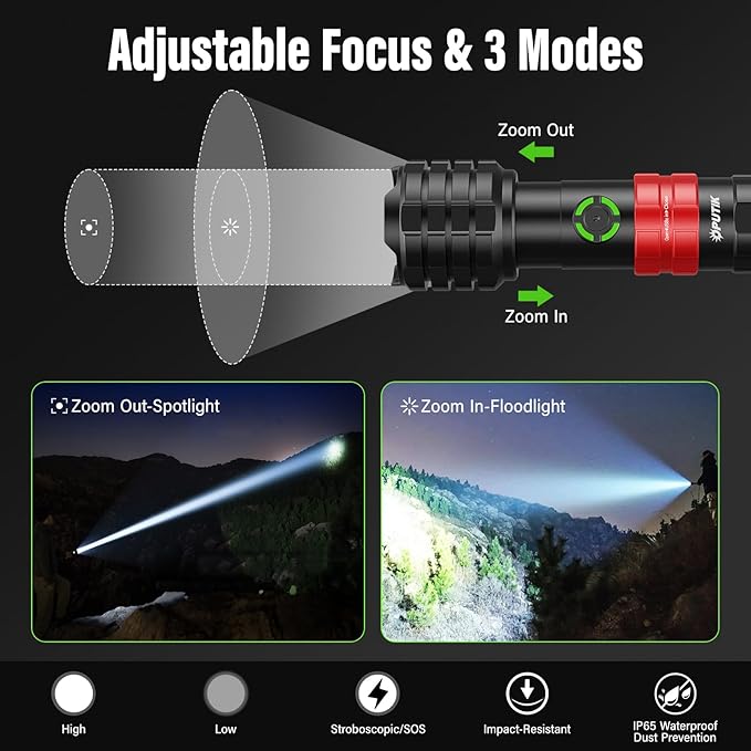 - 3 Lighting Modes & Zoomable Function ➤ LED flashlight has high,low,strobe lighting modes.Scalable adjustable focal length.Lighting range of approximately 180 meters.You can choose the appropriate lighting mode according to your needs.