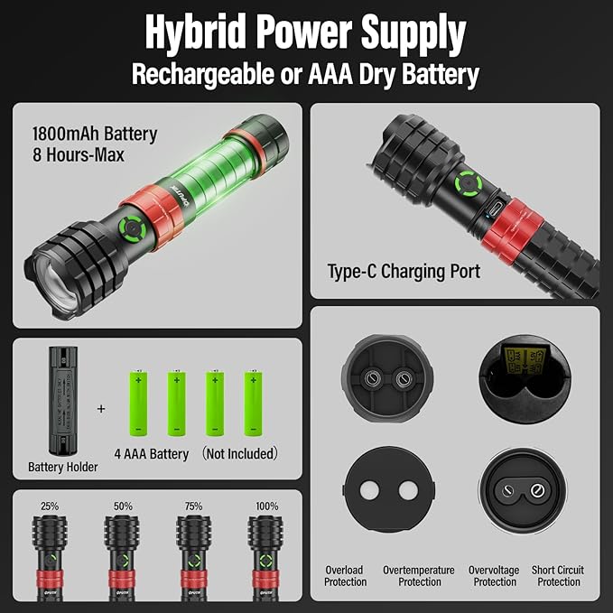 - Hybrid Power Supply ➤ 1800mAh rechargeable battery with a maximum range of 8 hours.Comes with a dry battery compartment that can accommodate 4 AAA batteries (AAA batteries are not included).When charging a flashlight,it has over temperature protection,over voltage protection,overload protection,and short circuit protection.
