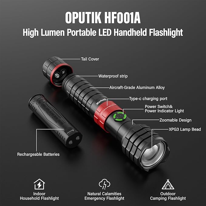- IP65 & Durable ➤ The body of the OPUTIK strong flashlight is made of military grade aluminum alloy.IP65 waterproof performance,can be used normally in rainy,desert,snowy and other adverse weather conditions.This high lumen powerful flashlights has undergone experimental testing and can withstand various collisions and drops.Very suitable for outdoor running,camping,cycling,exploration,and home.