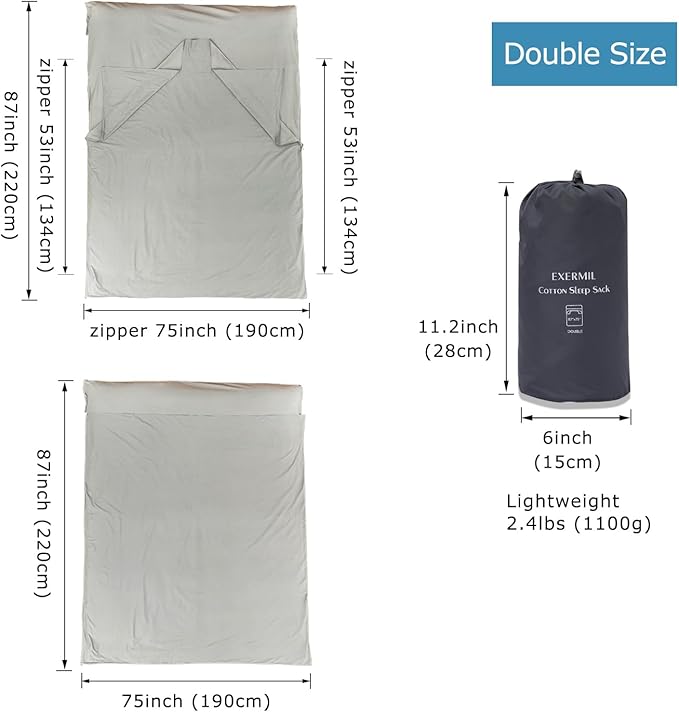 - This XL sleeping sheet provide you with comfort when traveling. It’s wide (87x43 inches) and allows you to turn inside it without being twisted. Full-length zippers run along left, right side and also the bottom of the sheet, which enables you to get in and out of easily from any side of your bed, stretch your feet out of the bag for comfort. This multifunctional sleep sack also turns into one giant cotton bed sheet (87X88 inches) when fully unzipped. The pocket keeps your pillow in place.