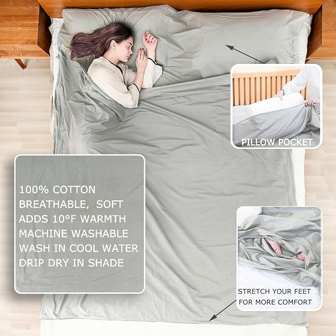 - Bring this travel sheet with you whenever you travel because the bleach on some hotel sheets is too harsh. No matter where you travel to the world, no matter what season, this cotton sleeping bag will make you feel like sleeping on your own cotton sheets at home, cool, clean, comfortable and safe.