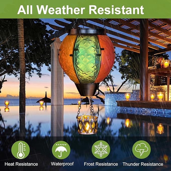 - Energy-Saving & Money:The outdoor hanging solar lantern is powered by free solar energy. The solar lights have built-in light sensor, which can automatically light up at night and recharge during the day. There will be no additional electricity charges and environmentally friendly. IP44 Waterproof solar lantern can be used both indoors and outdoors,can withstand all weather.