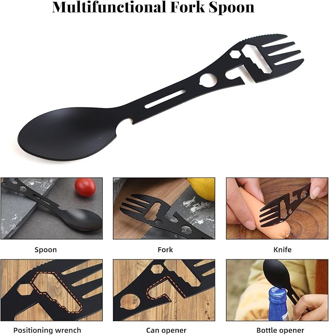 - Multi-functional Camping Sporks - Made of stainless steel, it can be a spoon, fork, bottle opener, can opener, or positioning wrench which will add more functions to your camping travel and feature a hole to attach it to a backpack with a keychain for portability