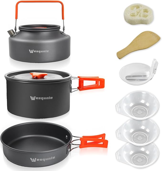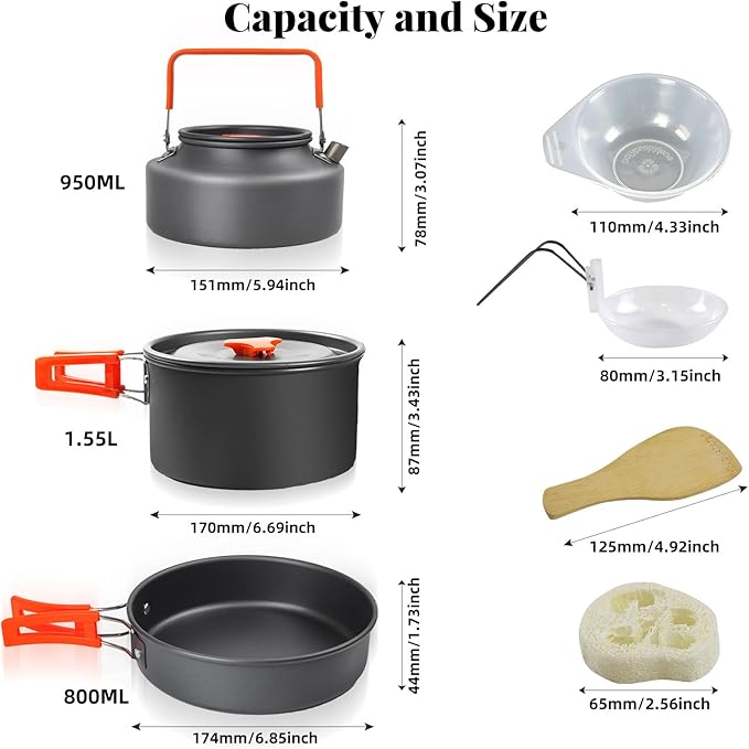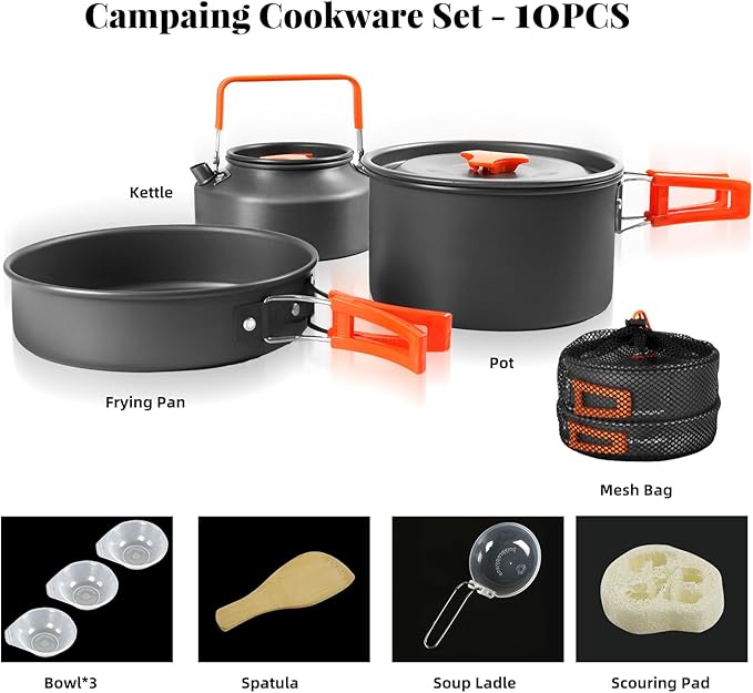 - 10PCS Outdoor Cooking Set - The camping utensils set includes 1 x pot, 1 x frying pan, 1 x kettle, 1x spatula,3x bowls,1x soup ladle, 1 x souring pad,1 x carrying mesh bag. A great choice for hiking, camping,mountaineering, picnic or other outdoor activities