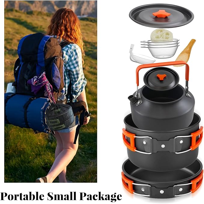 - Easy to Carry the Camping kitchen Accessories - The pot,pan and kettle can be nested together and other small camping cookware accessories can be packed into the kettle,the whole set can be packed into a mesh bag.It is easy to carry and saves space