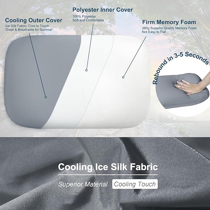 - Cooling & Skin-Friendly.Travel pillow's outer cover is made of ice silk, so you can feel cooling when you lay on the pillow. Cooling bed pillow is breathable and can allowing fresh air to flow throughout the camp pillow and making you wake up feeling refreshed.