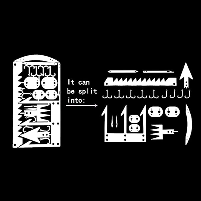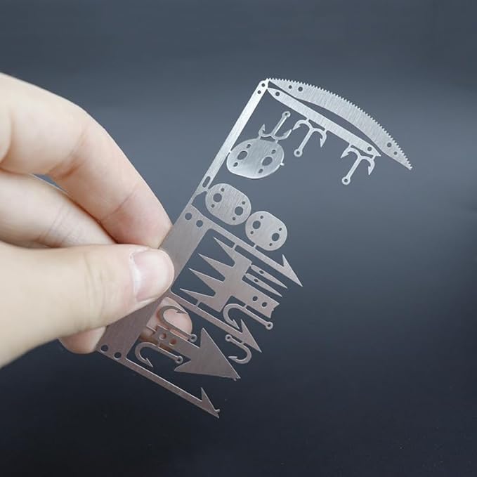 - 22 TOOLS IN 1: Our upgraded version of the Survival Cards offers an impressive 22 tools in one, providing you with a versatile multitool for various outdoor activities. The tools include 9 fish hooks, 4 snare locks, 1 arrowhead, 1 fork, 2 sewing needles, 2 saw blades, and 1 awl.