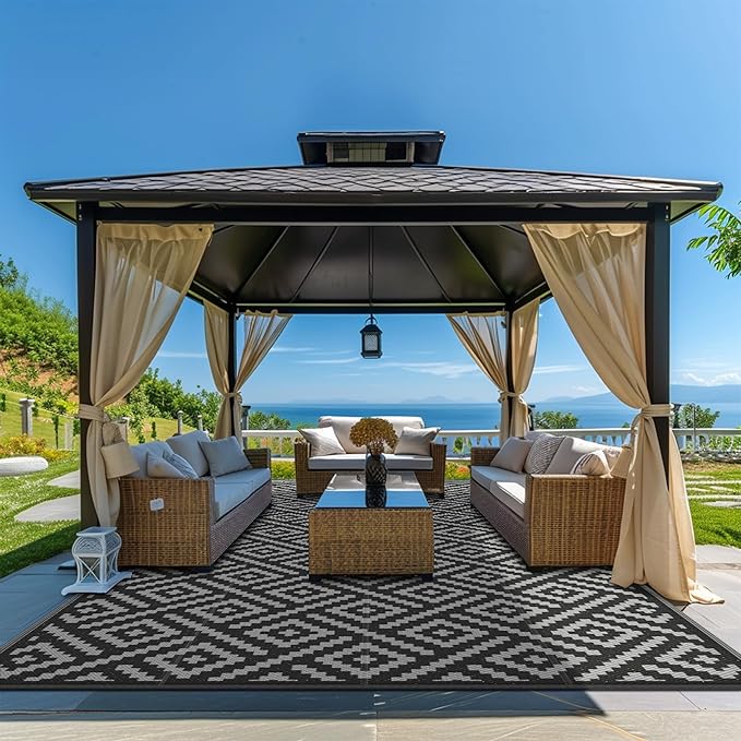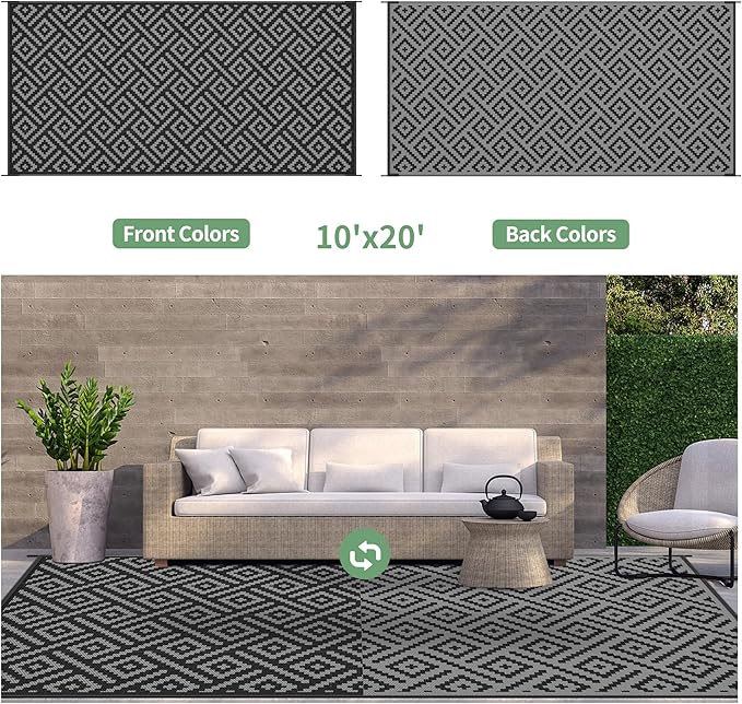 GENIMO Outdoor Rug Waterproof, 10' x 20' Reversible Plastic Straw Rug, Lightweight Large RV Camping Mat for Patio, Deck, Camper, Balcony, Backyard, Picnic, Black & Gray
