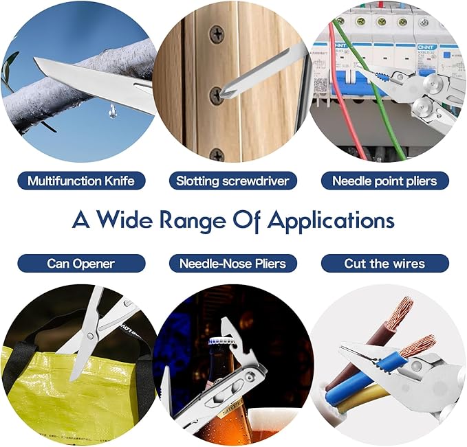 - Versatile Functionality: This JZHAN multitool is a versatile tool with 13 functions in one, including needle-nose pliers, tiger pliers, wire cutters, 5mm hex wrench, hammer, small scissors, crosshead screwdriver, flathead screwdriver, can openerand 6mm hex wrench.