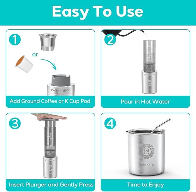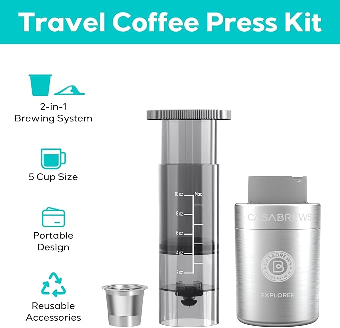 - Better Than French Press: No more bitterness or grit. The CASABREWS 2 in 1 portable coffee maker eliminates bitterness and acidity and creates a smooth, rich, full bodied cup of coffee. The stainless steel filter allows you to use finer ground coffee for a faster brew time and no grit. No more messy coffee grounds, clean up takes seconds! This manual coffee machine is perfect for travel, camping or gifting