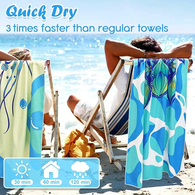 - SAND FREE AND HIGHTLY ABSORBENT: This microfiber beach towel is highly absorbent, absorbing up to 6 times its own weight. It is also sand resistant, so you can cover it on sand directly and quickly shake the sand when not in use. Using high-definition digital printing technology, the colour of the pool towels oversized does not fade easily, even after long periods of washing.