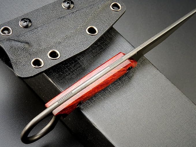 - Elegant Rosewood Scales Fixed Knife: The knife use D2 blade and stainless steel handle, D2 steel hardness is between 59-62. RoseWoood scales and kydex sheath make the knife be safety and convenient, have confidence that the blade will not slip with the security of the kydex sheath creates a tight hold when not in use.