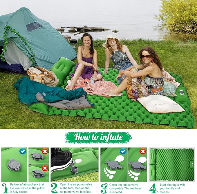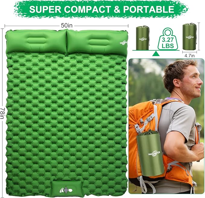 WANNTS Double Sleeping Pad, Ultralight Inflatable Sleeping Pad for Camping, Built-in Pump, Ultimate for Camping, Hiking - Airpad, Carry Bag, Repair Kit - Compact & Lightweight Air Mattress(Green)