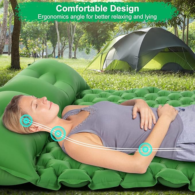 - 【Foot Press to Inflate-Only 1 min Needed】 There is no need to inflate with your hands, mouth, or a pump for our camping sleeping pad. It just only takes 1min after you inflate the sleeping mat fully by stamping the spot of the built-in pump with your foot.With anti-leakage films in the valves, you would never worry about air leaking when using it! Besides, super quick to deflate - take out the deflation plug.It's time to plan a camping and hiking with our innovative camping sleeping pad now!