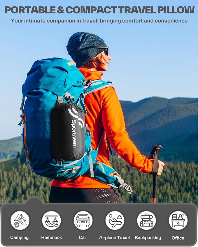 - Versatile Applications: The Sportneer travel camp pillow is designed for a wide range of uses, making it compatible with sleeping pads, bags, air mattresses, camping mats, and more. Ideal for camping, backpacking, travel, hammock relaxation, chair lounging, airplane trips, RV adventures, or tent camp. You can also use the portable pillow in the office or on the sofa in the living room. Wherever you want to rest, our comfortable pillow improve your sleep quality of your travel.