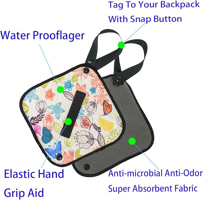 - 【HOW TO USE】You only need to wipe it with the absorbent side (the side with no pattern)during use, and the back can be gripped by the strap to make the process safer without worrying about the pee cloth falling off. The colourful pattern on the back adds a touch of colour to your journey. After use, you can choose to close the side with a button or wash it in water and hang it on the backpack to dry.