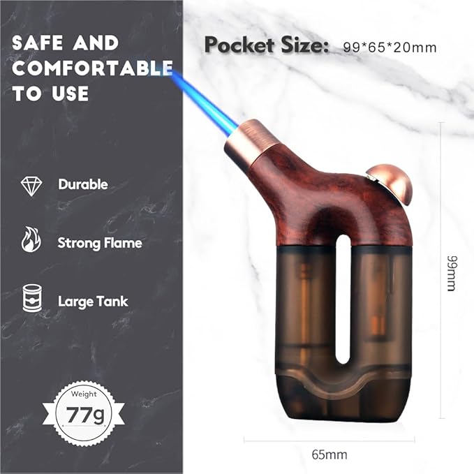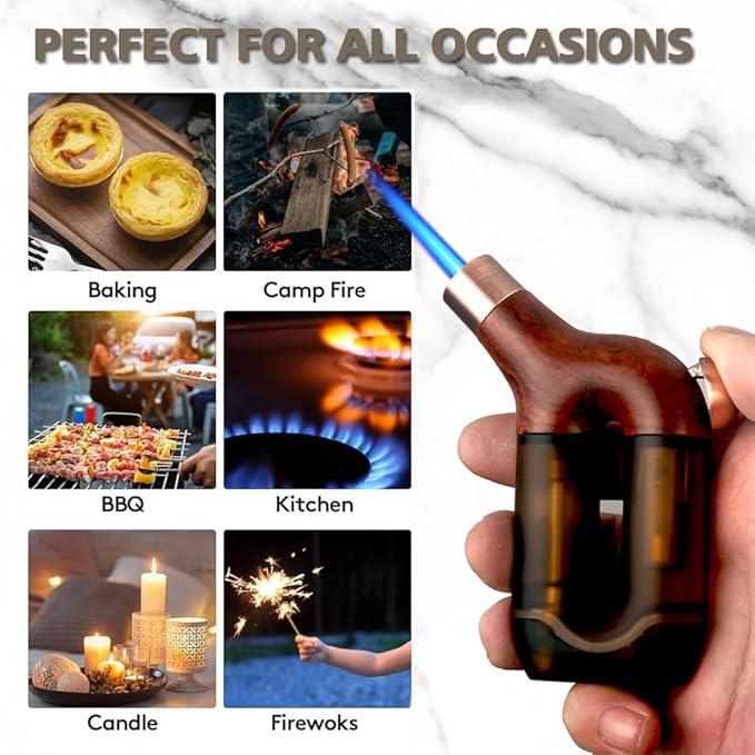 - 【SAFE & SIMPLE IGNITION BUTTON】Smooth single action on ignition trigger:you only need to press it to get the flame and release it to turn it off. The advantage is that one hand can fully control this torch lighter.