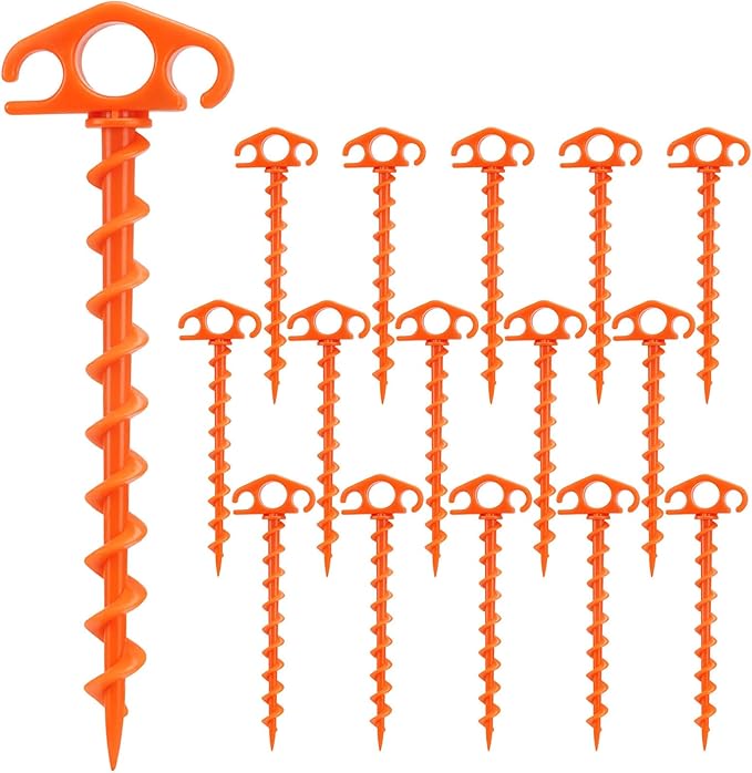 Tent Stakes Sand Stakes for Beach Tent Spiral Anchor Stakes 9.4 Inch Heavy Duty Screw Canopy Stakes for Camping, Hiking and More (16, Orange)