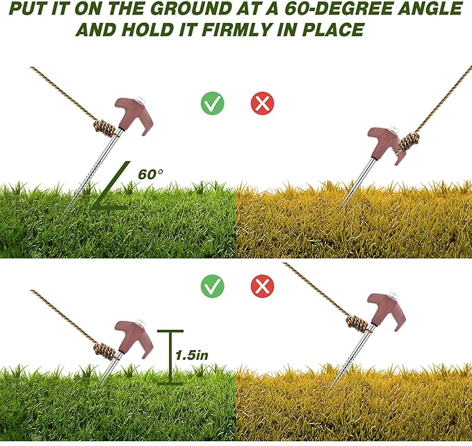 - Strong and Secure: our tent stakes heavy duty screw offer enough strength under windy conditions and are suitable for use in grass, dirt, harder soils and sand; They are important for taking care of your outdoor equipment; Pointed items are included, it is recommended to wear tool gloves to avoid injury when using, and please keep it away from kids