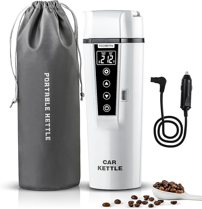 - Humanized Design : BLONGKY 12v water kettle have a wide-angle flip-lid design and a small-caliber water outlet. and water is not easy to spill. The side plug design of the small car electric kettle makes it easy to fit into a car cupholder. The portable kettle for car also comes with a carry bag to reduce the likelihood of losing the power cord.