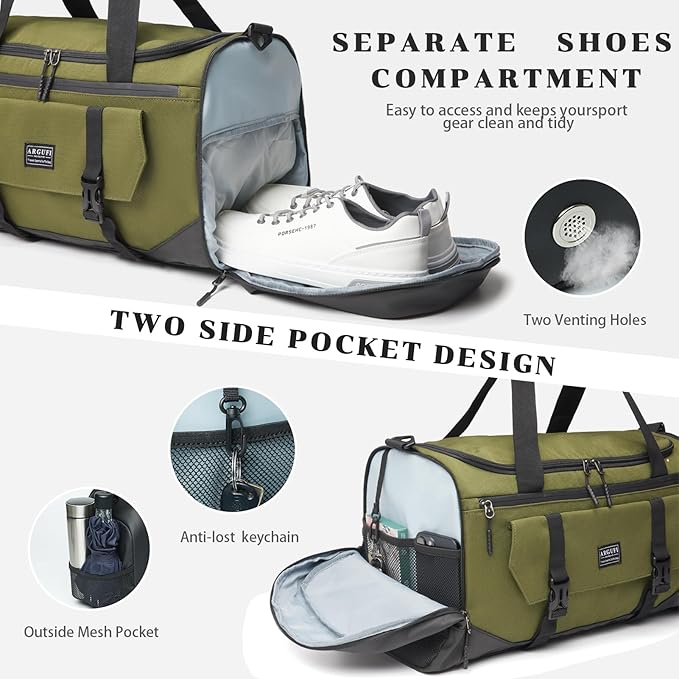 - [Shoe Compartment] Features A Large Bottom Zipper Pocket To Separate Shoes, Toiletries, Clothes And Other Items. travel Duffle Bag Is Perfect For An Overnight Stay Or A Carry-on Addition To Your Luggage. Fits up to a men's size 14 shoe!The shoes compartment has 2 air vents to disperse the bad smell of shoes.