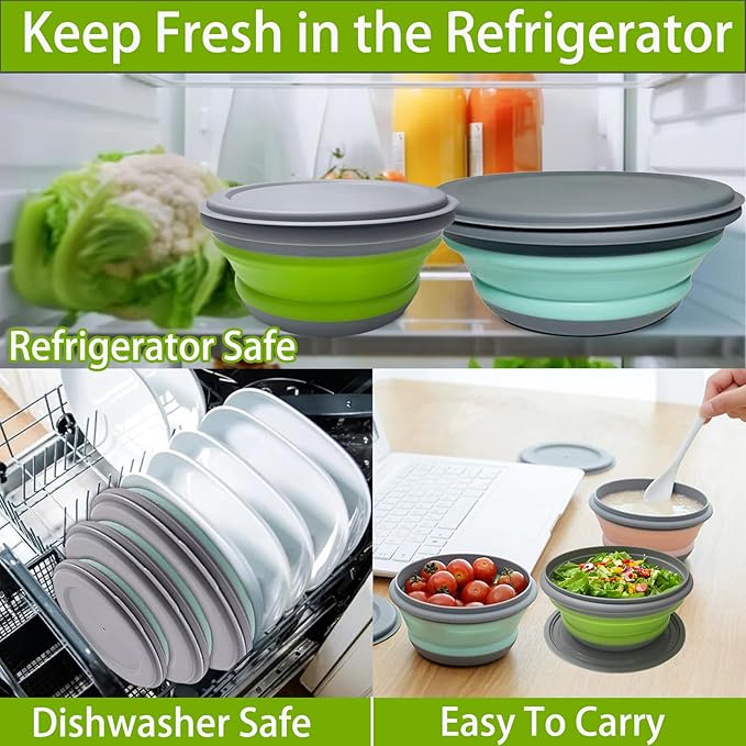 RMAMSCOV Camping Bowl, 3 PCS Food Grade Silicone Collapsible Bowl Lunch Box Salad Bowl with Lid, Expandable Food Storage Containers Set with Free folding tableware and storage bag (Green-1000ml)